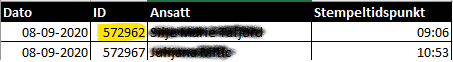 Eksempel på referanseliste. ID (gult) henviser til personnummer som du taster inn (grønn)