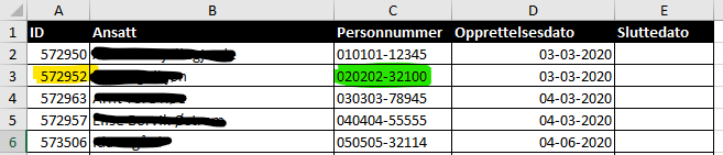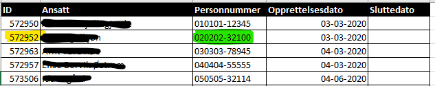 Dette laster ned en Excel fil der du taster inn personnummer på alle ansatte (også tidligere ansatte) Denne listen skrives ut som PDF og lagres sikkert.