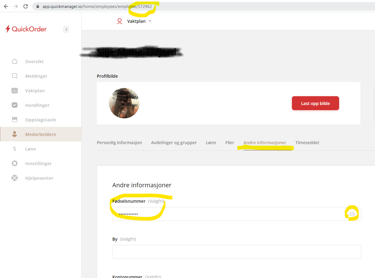Tips: Det ID som står på Personalelisten er det unike nummer som også står i URL banen i Quickmanager. Så ansatte nummer 572962 har URL: