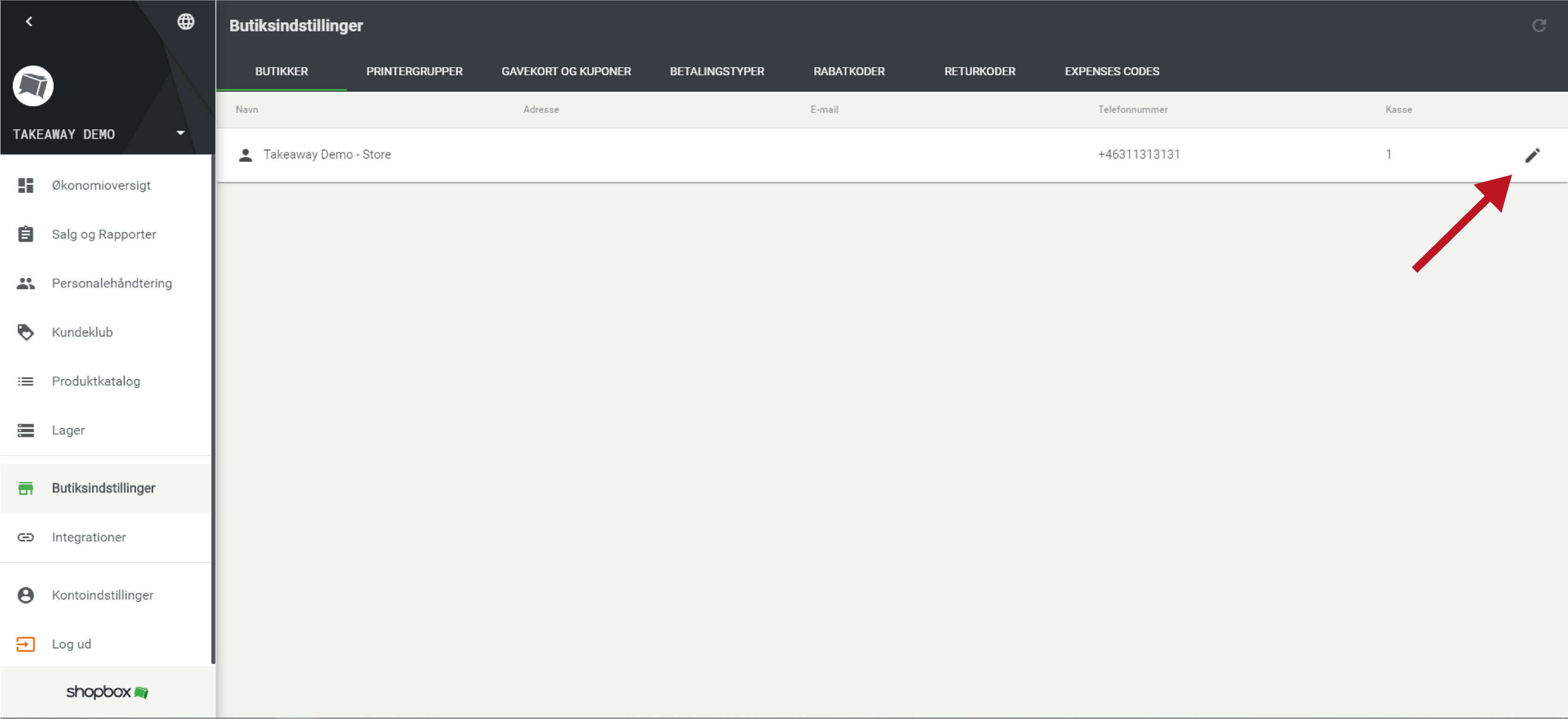 - Klikk på «pennen» til høyre for den butikken hvor du ønsker å designe kvitteringsprint