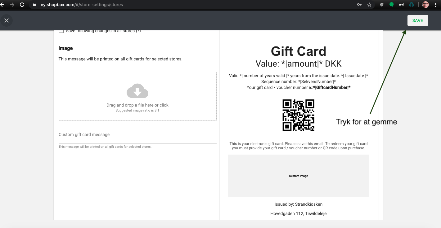I tillegg kan du legge til en melding som vil stå på alle utstedte gavekort. Du kan se alle endringer du gjør i boksen til høyre.